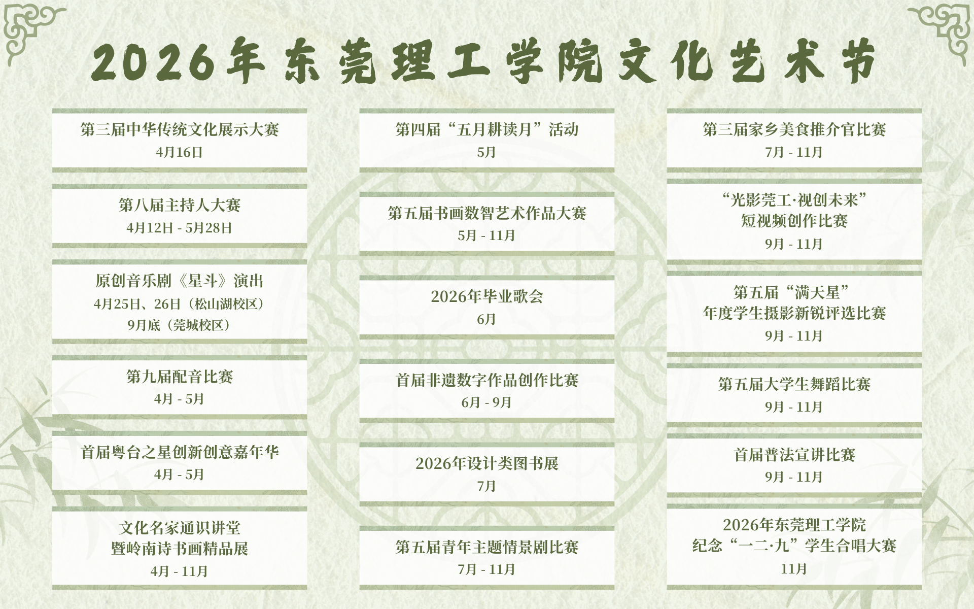 据了解,我校2026年文化艺术节于4月至12月举行,为期八个月,将有18项子活动陆续开展,着力打造具有莞工特色的高品质校园文化矩阵,旨在为师生搭建展示自我、锻炼能力、交流学习的平台,进一步繁荣校园文化生活,引导广大师生在实践中感悟文化魅力,增强文化自信,促进全面发展。
